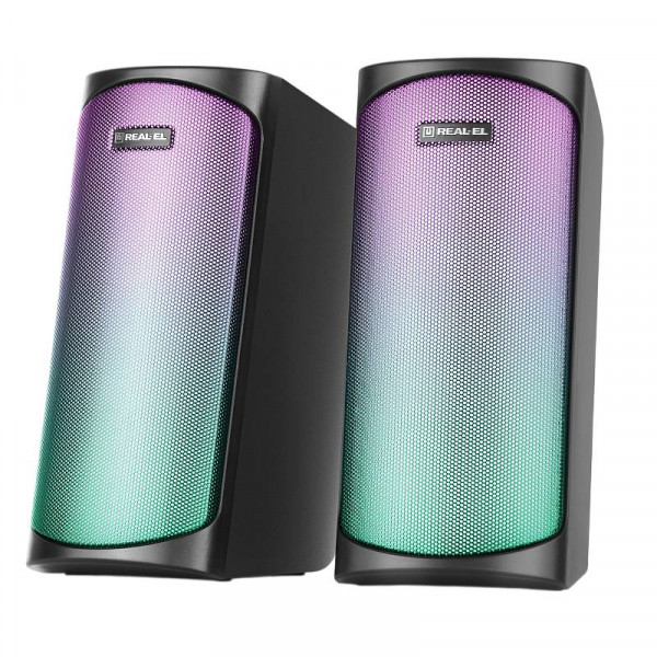 Мультимедійна акустична система REAL-EL S-135 це легке та доступне рішення для озвучування комп ютера чи ноутбука. АС оснащена вбудованим підсилювачем та акустичним кабелем, тому її можна швидко підключити практично до будь-яких джерел аудіосигналу. Живлення здійснюється через USB-порт ПК, ноутбука або блок живлення 5V DC за допомогою вбудованого кабелю USB. REAL-EL S-135 має зручний пульт керування, що дозволяє регулювати гучність одним рухом без необхідності торкатися самої колонки. Це робить користування ще більш простим та комфортним. Підсвічування з RGB-світловим масивом додає динаміки та створює яскраву атмосферу, коли ви хочете додати настрій під час прослуховування чи перегляду відео.