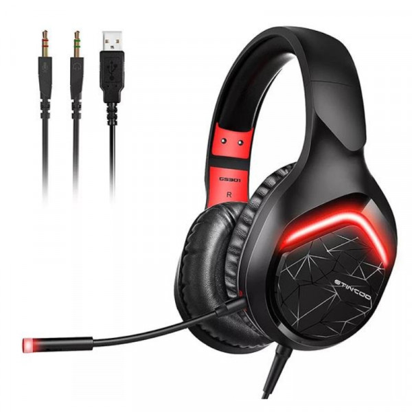Особливості: 1. Подвійний режим, можна легко змінити режим гри/звуку. 2. Навушники мають багатокутний дизайн, зі світлодіодним підсвічуванням. 3. З легкою конструкцією немає тиску для тривалого носіння. 4. Мікрофон можна легко зігнути, він може вловлювати звук із навколишнього середовища. GS301 розроблений зі світлодіодним підсвічуванням, щоб покращити ваші враження від гри. Підходять для великих розмірів голови, щоб забезпечити зручність носіння. Крім того, він розроблений для тривалих ігрових сесій. Приємні для шкіри великі амбушюри, що дихають, м'які, але збережуть форму. Включаючи мікрофон з шумозаглушенням, тому ваш тимейт може бути чути голосно і чітко, не відволікаючись на шум фону.