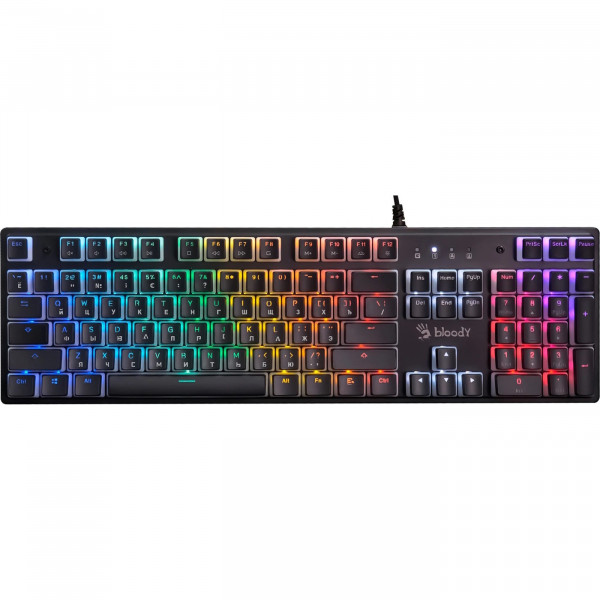 Кастомізована клавіатура із новітніми BLMS-перемикачами забезпечує максимальній комфорт та блискавичну швидкість спрацювування. Особливості Механічний перемикач Bloody BLMS. Спеціально налаштовані точка та сила спрацьовування, щоб дати гравцям незвичайну швидкість та відчуття! 100% N-клавішне натискання. Кожне натискання реєструється незалежно від того, скільки клавіш натиснуто або утримується одночасно 4 Мб пам яті. Клавіатура запам ятовує до 120 000 макросів 1-мс відгук клавіш. Технологія Ahead Quick Step забезпечує миттєве спрацьовування клавіші за 1 мс. Частота опитування 1000 Гц. Нескінченна підтримка паралельного введення із частотою опитування 1000 Гц дозволяє користувачеві виконувати 100% функцій в ігрових ситуаціях. Кейкапи з подвійним литтям. Унікальний виробничий процес, у якому два шматки пластику відливаються разом, гарантує, що символи ніколи не зітруться з часом. Максимальний досвід набору тексту та довговічність Елітне програмне забезпечення Bloody KeyDominator. Створюйте власні макроси за допомогою Bloody KeyDominator, яку можна завантажити на сайті bloody.com.