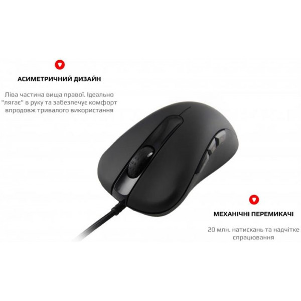 Неймовірно зручна та потужна миша Motospeed стане незамінним складником твоєї перемоги. Ідеальний дизайн, який гарантує комфортні відчуття і знижує втому. Точне збирання та якісний пластик, відсутність люфтів і надмірних зазорів подарують задоволення від користування. Механічні мікроперемикачі OMRON Неперевершена легендарна японська якість. Перемикачі дають повний контроль над дією і швидкісне спрацьовування. Надійність, довговічність і точність повторення зусилля натискання, один до одного, від партії до партії. Чітке і тактильно приємне натискання кнопок без люфтів. RGB Яскрава й ефектна повноколірна підсвітка RGB з 16.8 млн. кольорів занурить вас в атмосферу гри. Тефлонові ніжки та кабель із застібкою Товстий тефлон великої площі забезпечить чудове ковзання і тривале використання. М який і гнучкий високоякісний кабель гарантує довговічність і зручність використання, а застібка допоможе організувати кабелі на робочому столі та в подорожі.
