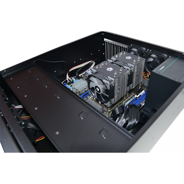 Цей сервер зібраний в корпусі 4U і для його розміщення потрібна серверна стійка 19 дюймів завширшки шириною і глибиною від 60 см. Відмінний варіант для підприємства або офісу, як термінального сервера, сервер для 1С бухгалтерії, для розміщення сайту. Або як машина для складних обчислень: рендеринг, симуляція тощо.