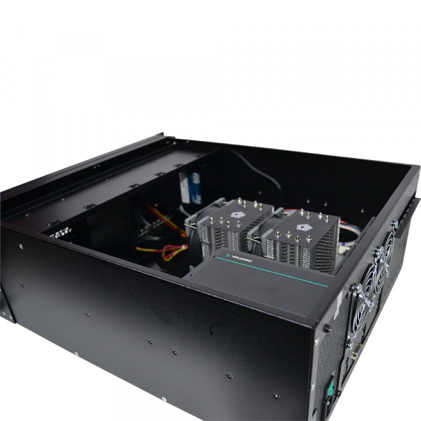 Серверний корпус призначений для двопроцесорних систем у форматі 4U зі встановленням у шафу глибиною 600 мм. Система охолодження складається з чотирьох вентиляторів 80х80х25 мм. Живлення - 1 блок живлення АТХ стандарту. Можливе встановлення до 4х дисків формату 2,5/3,5