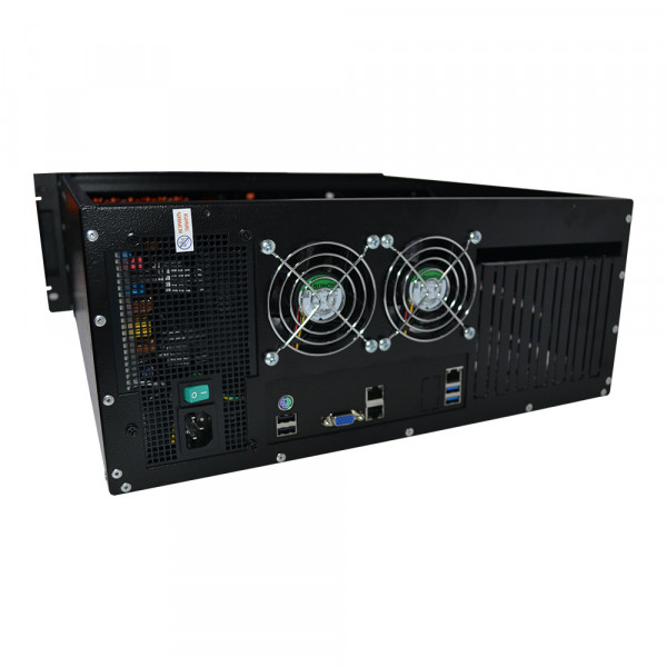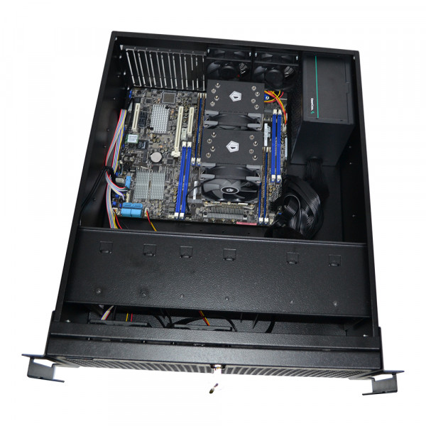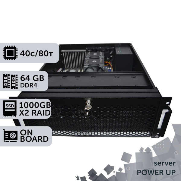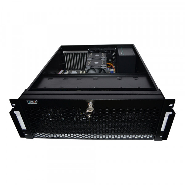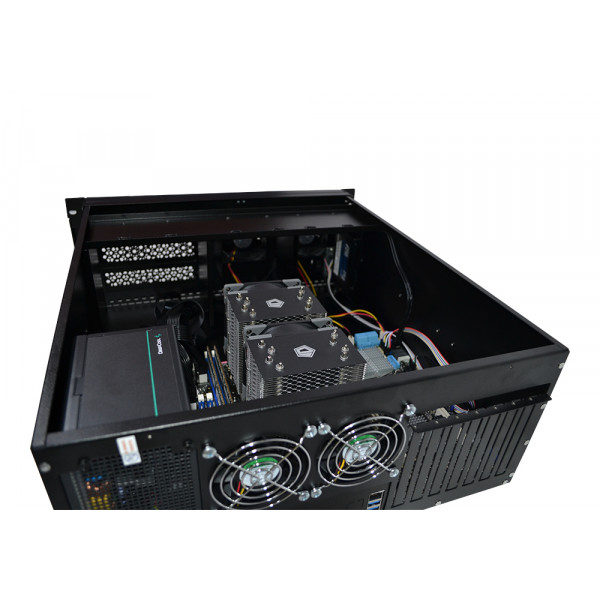 Цей сервер зібраний в корпусі 4U і для його розміщення потрібна серверна стійка 19 дюймів завширшки шириною і глибиною від 60 см. Відмінний варіант для підприємства або офісу, як термінального сервера, сервер для 1С бухгалтерії, для розміщення сайту. Або як машина для складних обчислень: рендеринг, симуляція тощо.