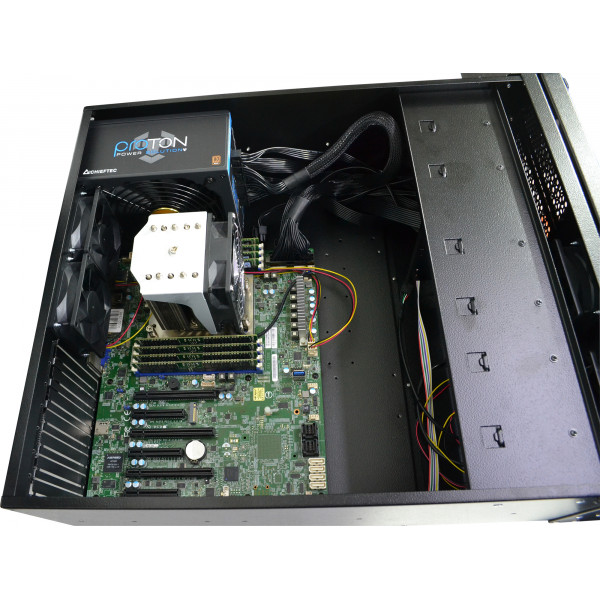 Цей сервер зібрано в корпусі 4U і для його розміщення потрібна серверна стійка 19 дюймів завширшки завширшки і глибиною від 60 см. Відмінний варіант для підприємства або офісу, як термінального сервера, сервер для 1С бухгалтерії, для розміщення сайту. Або як машина для складних обчислень: рендеринг, симуляція тощо.